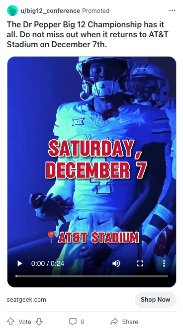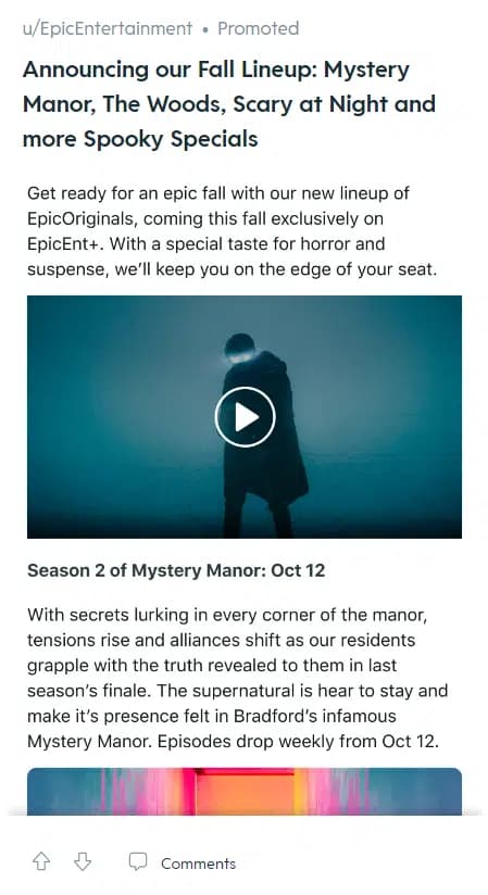 Description: A high-visibility video ad placement ensuring the brand’s ad is the first in-feed promoted post users see when they open Reddit.