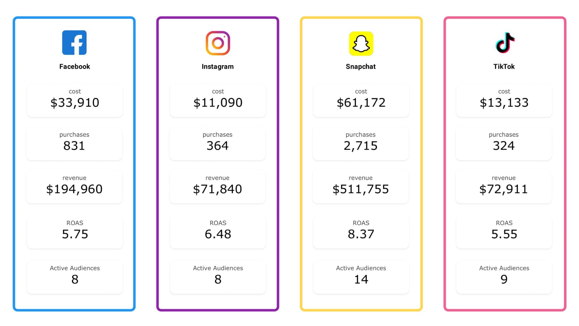 See aggregated data from campaigns across platforms like Meta, Snapchat, TikTok, Google, Pinterest and more all in one place.